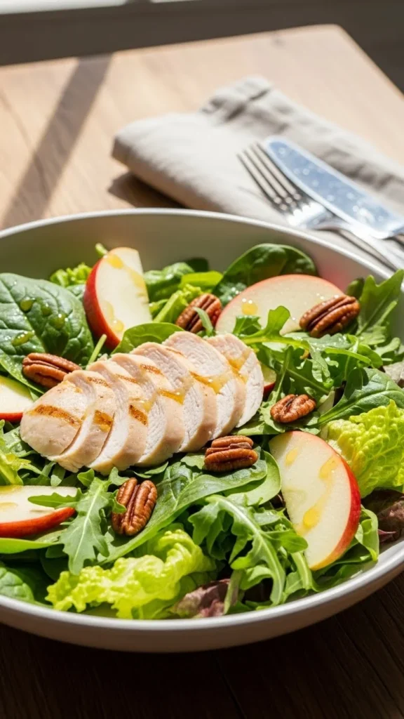 - Top with chicken, apple slices, and pecans.