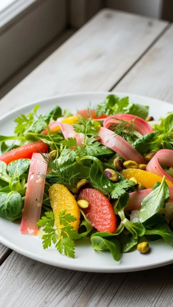This salad leans into sharp, fresh flavors. The rhubarb brings tartness, citrus adds juiciness, and pistachios give crunch. It works best when everything is sliced thin and kept light.