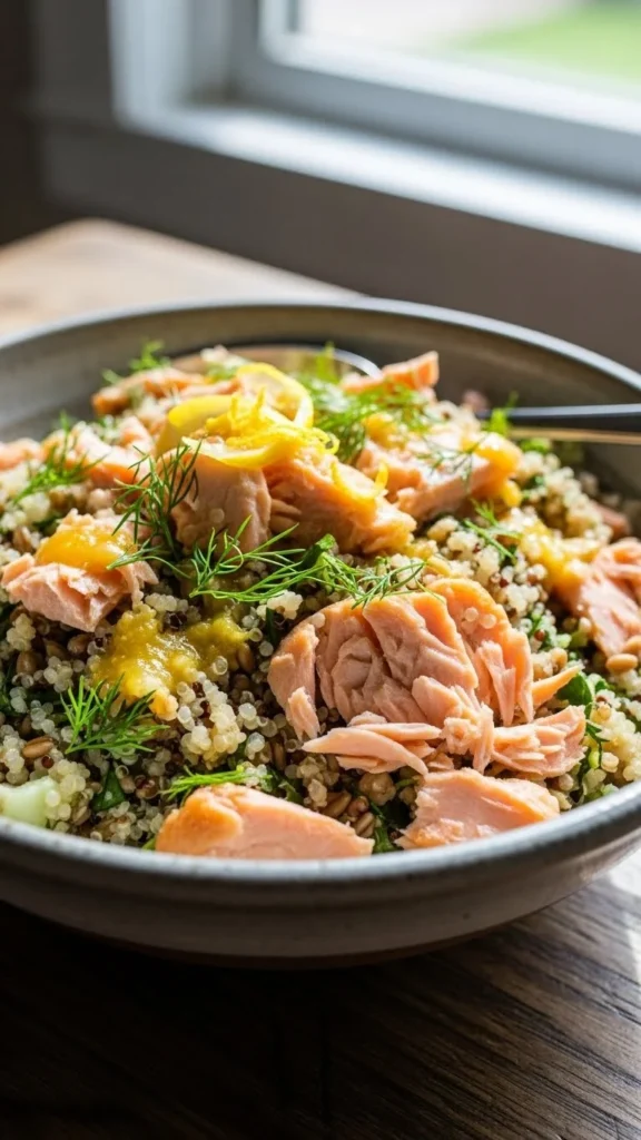 This salad is designed for leftovers. Cold salmon works perfectly here, and grains make it filling without feeling heavy.