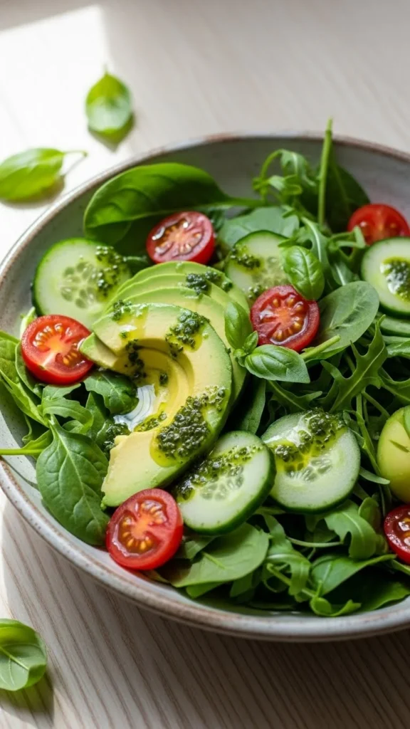 25. Avocado, Tomato, and Cucumber Spring Salad with Basil Oil