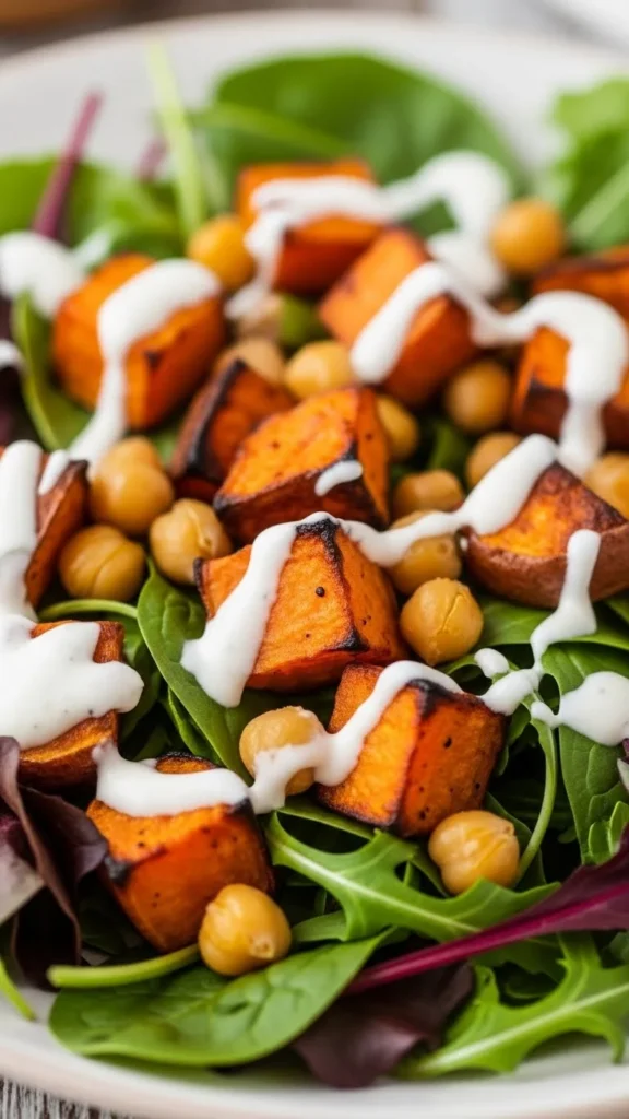 This salad is comforting without being heavy. The roasted sweet potatoes add warmth, chickpeas give texture, and the yogurt dressing keeps everything balanced.