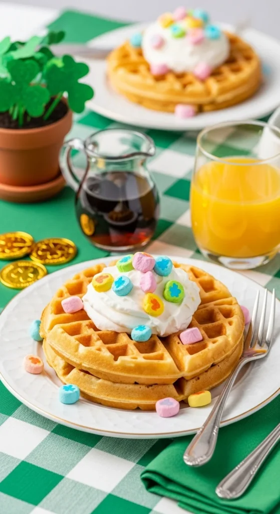 These waffles are pure fun, especially if kids are involved. The base is simple and familiar, and the cereal topping turns it into a St. Patrick’s Day treat without needing any food coloring or complicated steps.