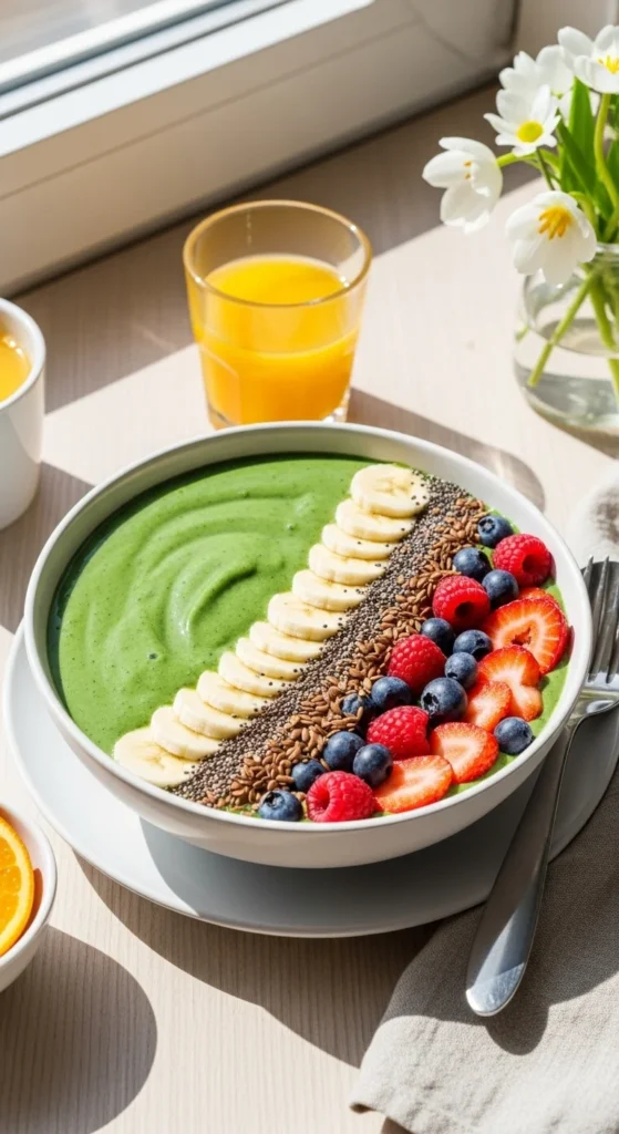 If you want something light and naturally green, this smoothie bowl does the job without tasting “too healthy.” The banana keeps it sweet, and the spinach blends in smoothly, making it approachable even for beginners.