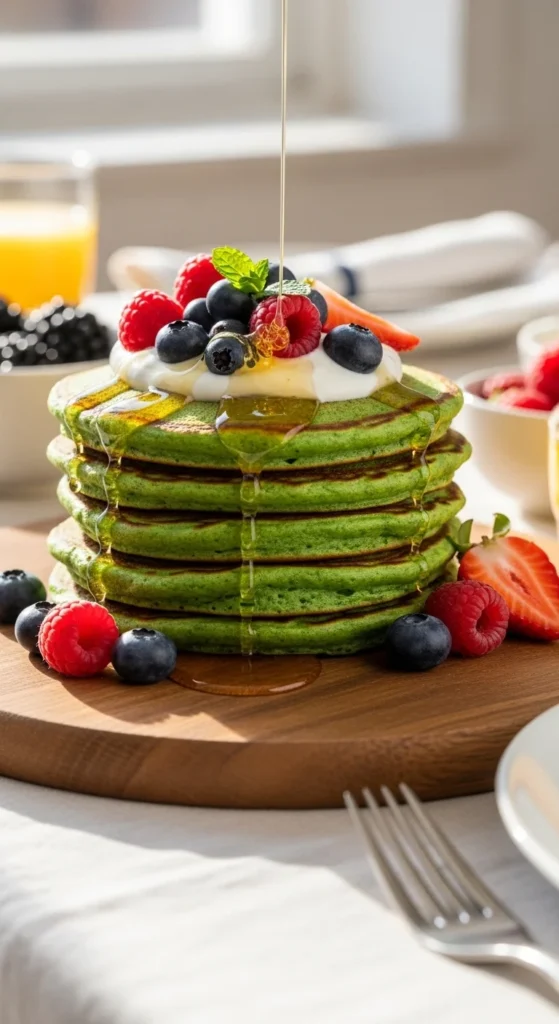 These pancakes don’t taste like spinach at all, which surprises most people. The spinach blends right into the batter, giving you a soft green color without food dye. They’re fluffy, lightly sweet, and perfect if you want something festive but not overly rich.