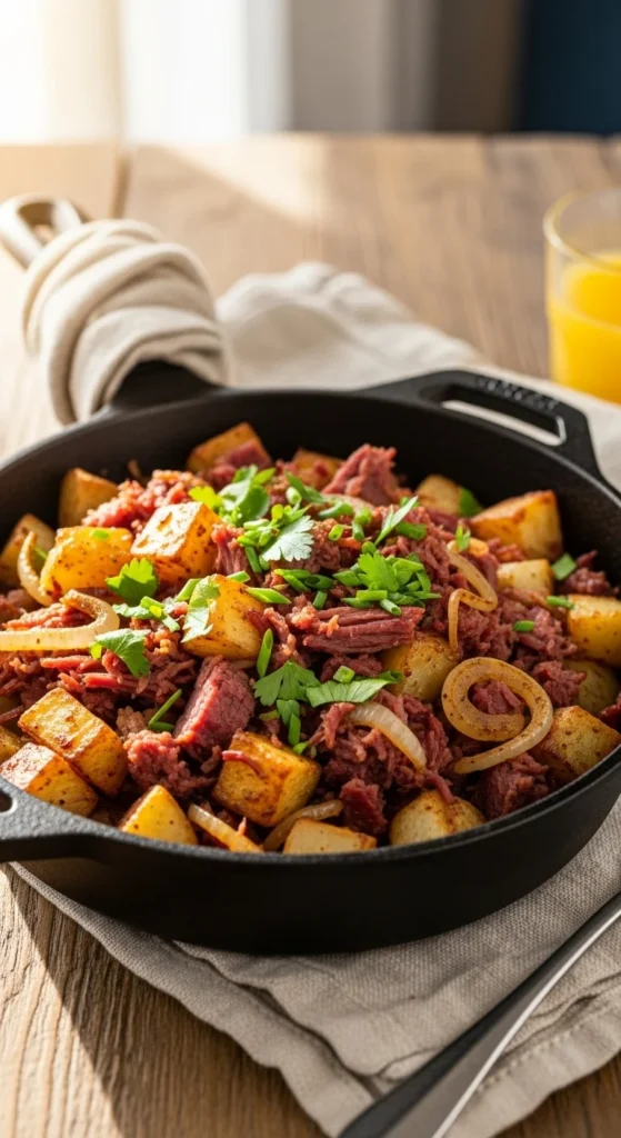 This is the kind of breakfast that actually keeps you full. Crispy potatoes form the base, corned beef brings the salt and richness, and everything cooks in one pan so the flavors build instead of staying separate. It’s ideal if you have leftover corned beef and want something hearty without turning it into another sandwich.