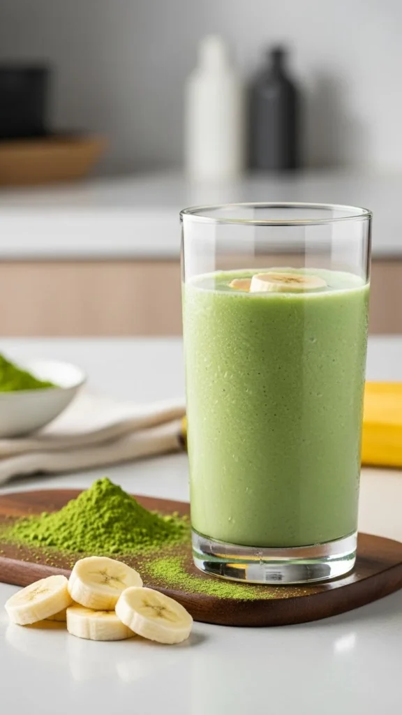 Matcha deepens the green color and adds a subtle earthy note. Banana keeps the flavor balanced and smooth, making the drink easy to enjoy.
