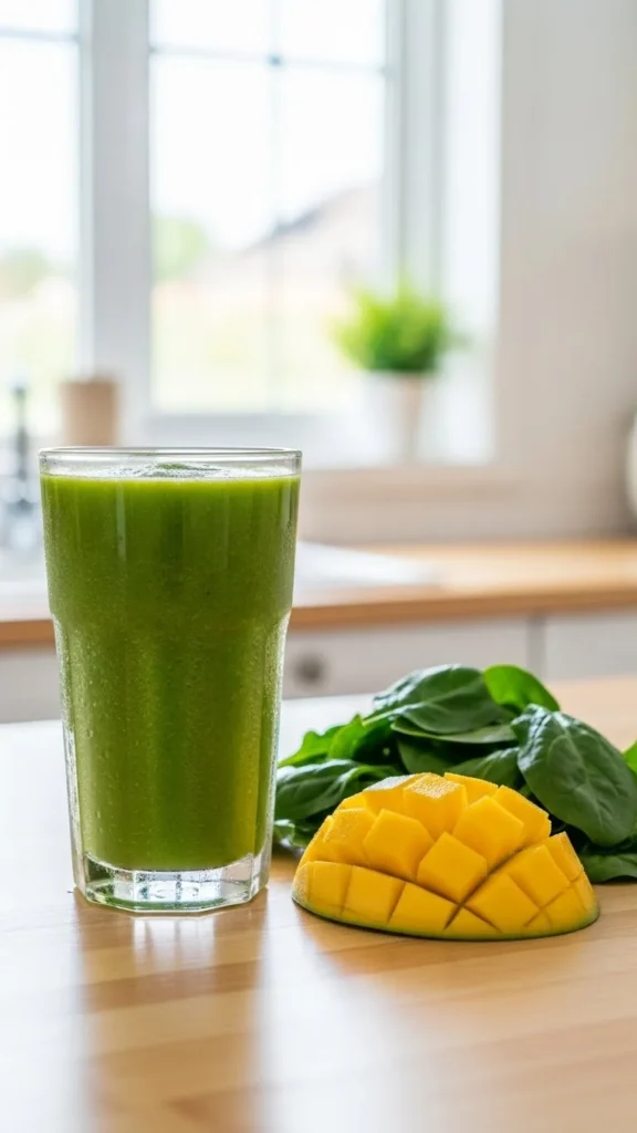 Mango brings sweetness and a soft texture that blends easily with spinach. The result tastes fruity while still keeping a clean green look.
