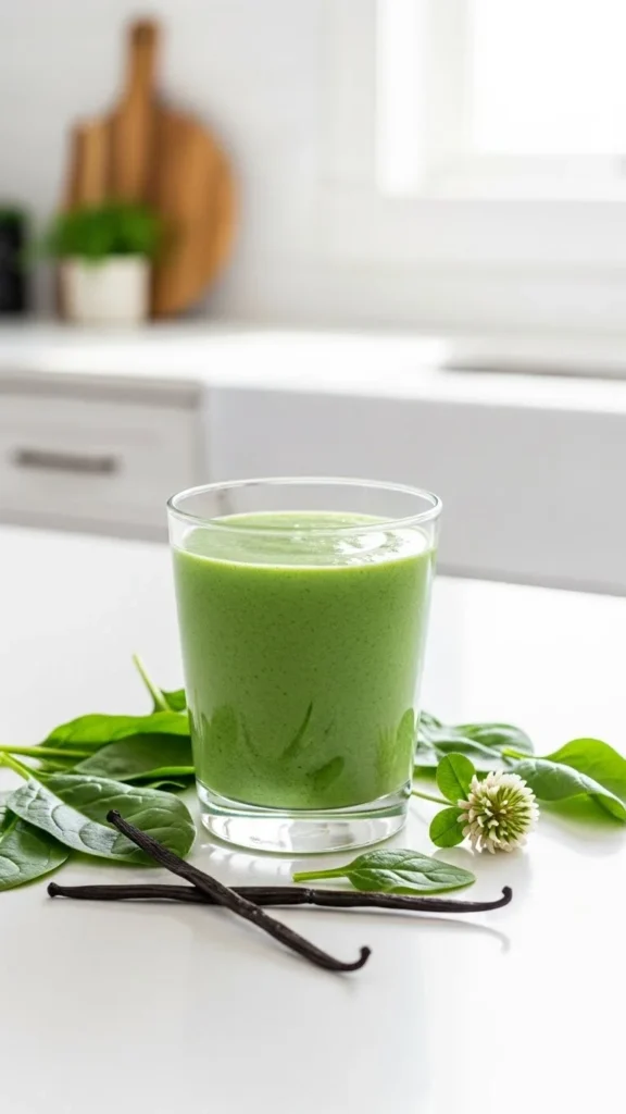 This smoothie keeps the flavor familiar with vanilla while mint adds a gentle freshness. The color comes naturally from spinach, and the texture stays smooth and easy to drink.