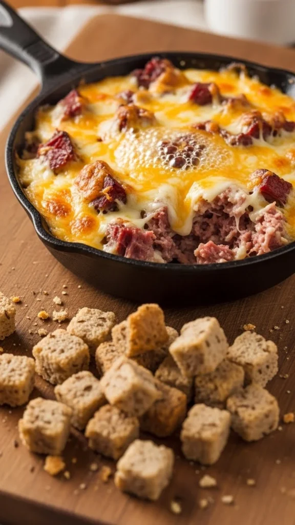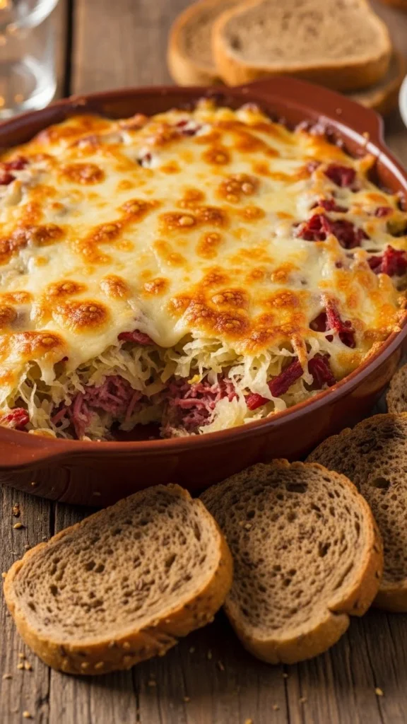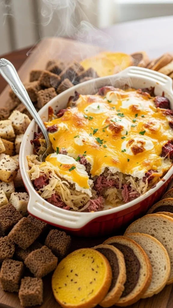 This dip brings familiar Reuben flavors into a shareable format. It’s rich, filling, and best served hot straight from the oven.