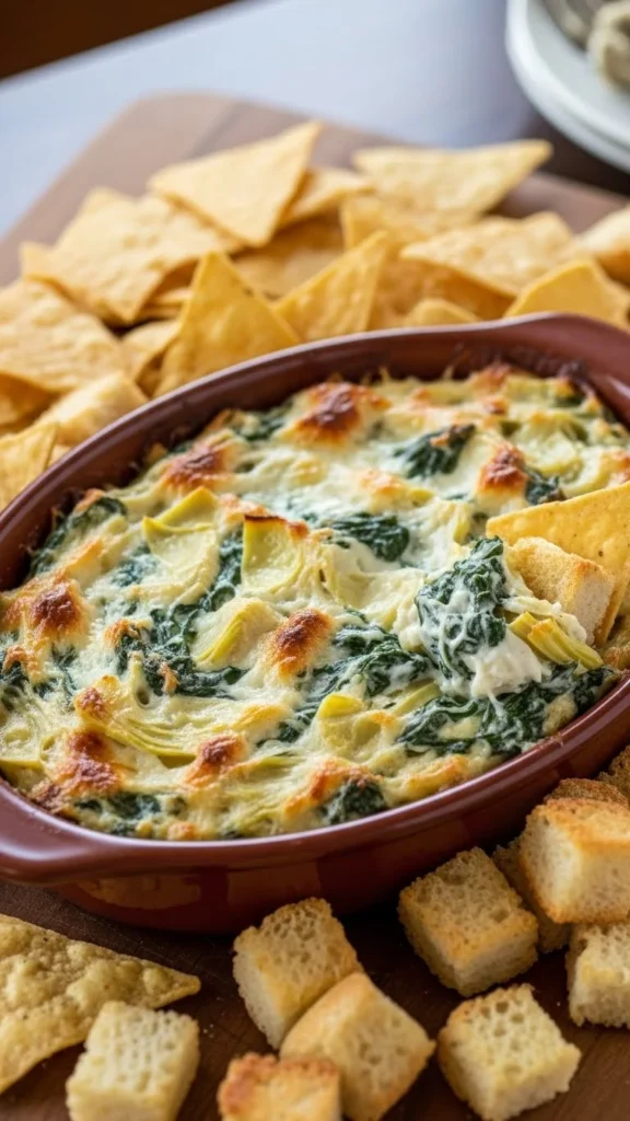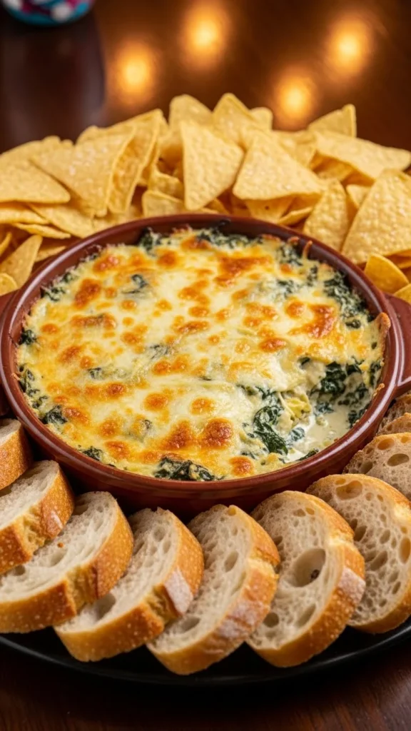 A bubbling baked spinach dip with lightly browned edges, served straight from the oven with tortilla chips and bread cubes.