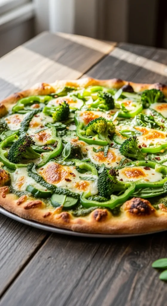 This pizza skips food coloring and lets the toppings create the color. Pesto keeps the flavor fresh and herby, and the mozzarella balances it so it still feels like comfort food, not a salad on dough.