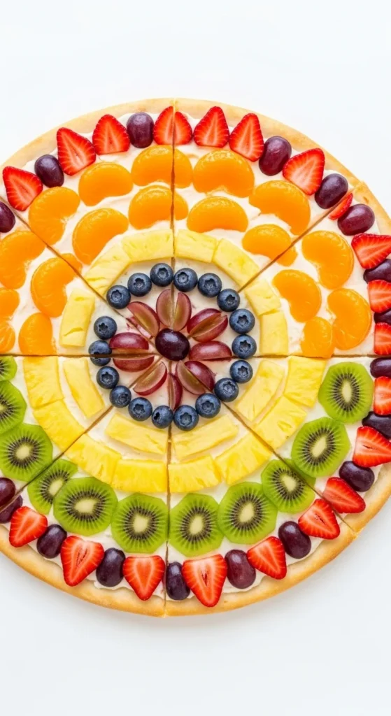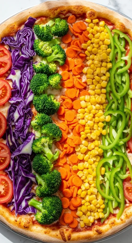 This pizza leans into the holiday theme without using dye. The rainbow toppings make it fun and visual, especially for kids, while still tasting like a normal veggie pizza.