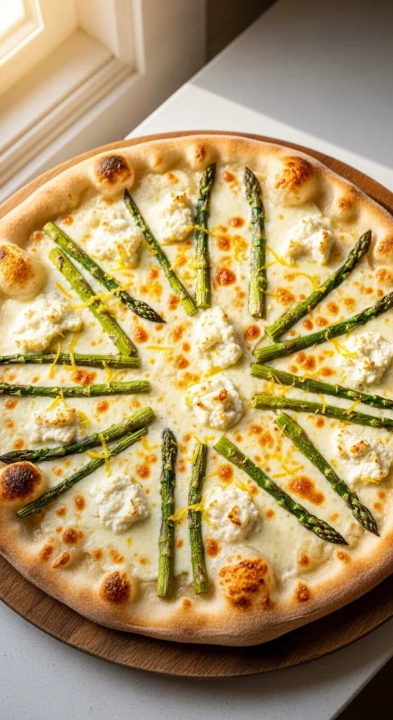 Let the pizza rest for about one minute so the cheese sets slightly. Slice cleanly and serve on a flat board so the asparagus stays in place. This pizza pairs well with simple sides like roasted potatoes or a light salad and works well for both dinner and casual gatherings.