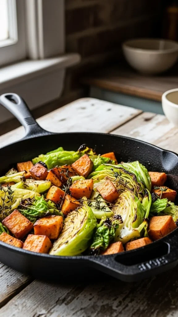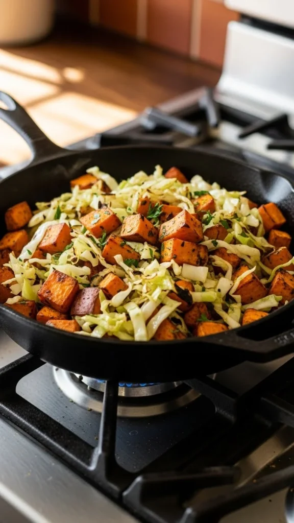 This dish is a good choice when you want something filling but not heavy. Sweet potatoes bring natural sweetness, while cabbage adds texture and keeps the dish balanced. Everything cooks in one pan, which makes it practical for weeknight dinners.