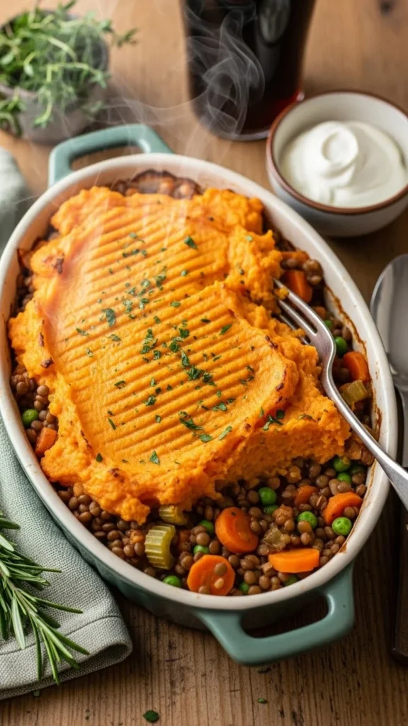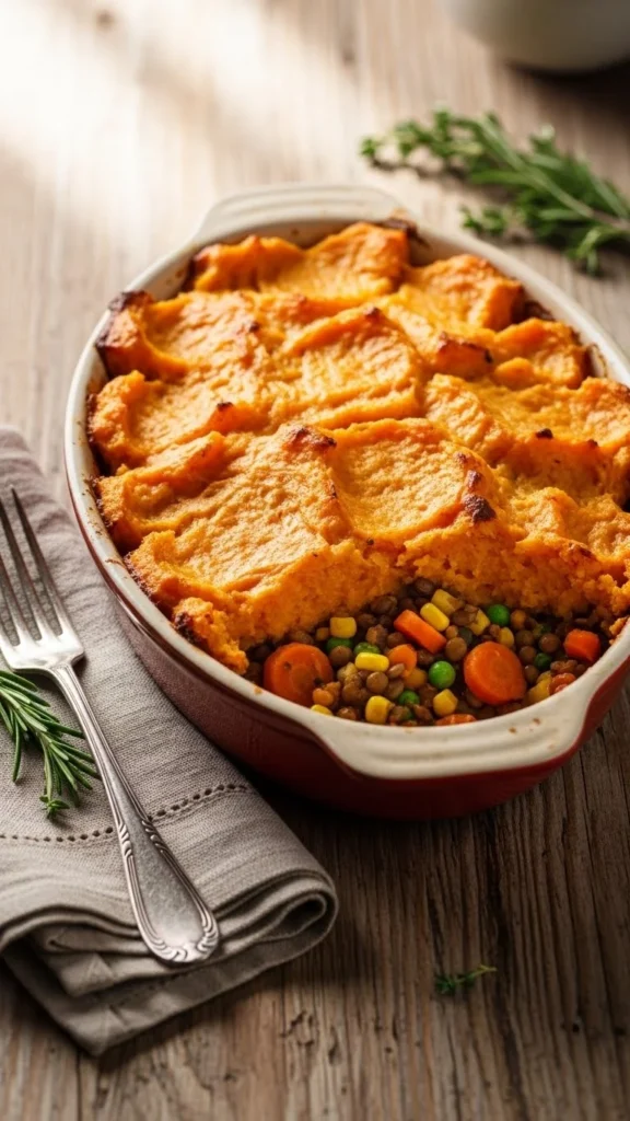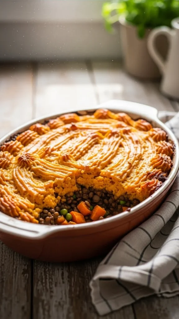 This version keeps the comfort of shepherd’s pie without relying on heavy meat or butter. Lentils provide structure and flavor, while sweet potatoes add natural sweetness and color.