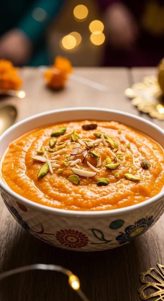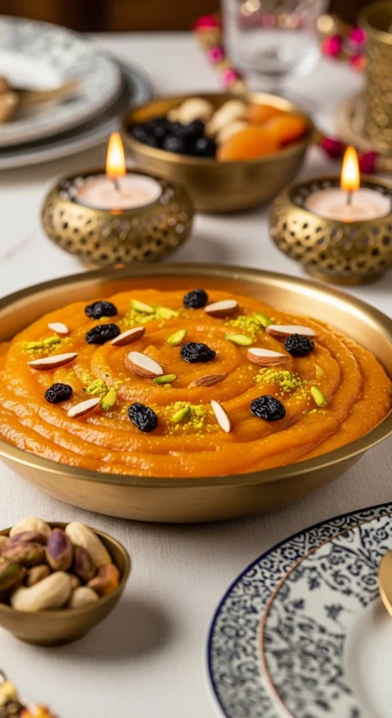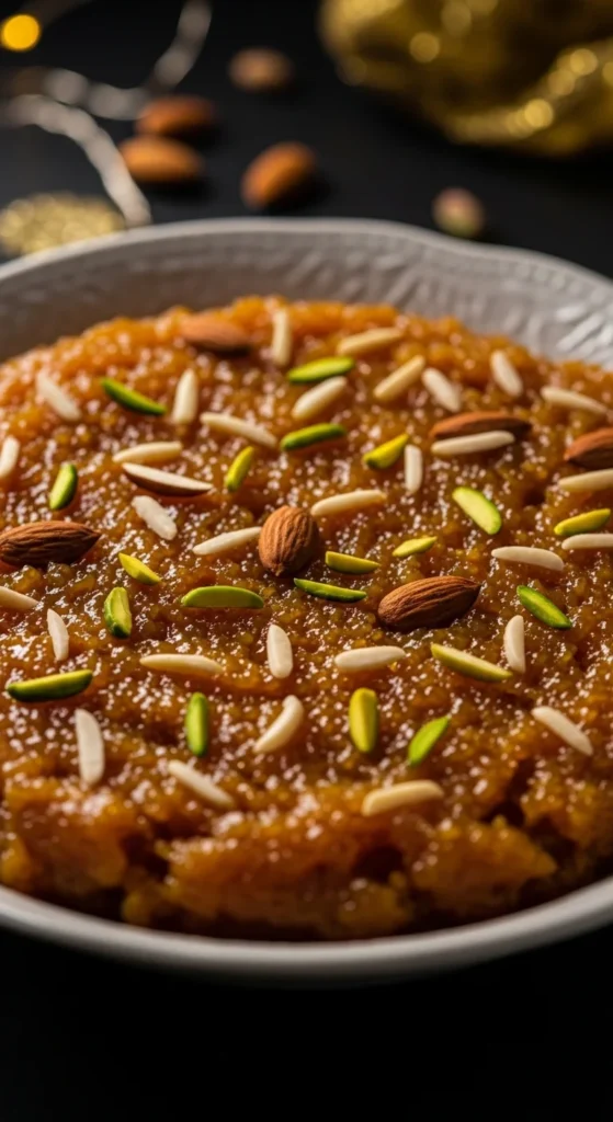 Serve warm because that is when it tastes best. Spread it slightly flat in a dish and decorate with nuts so it looks festive without effort. A small drizzle of ghee on top right before serving makes it extra soft and glossy.
