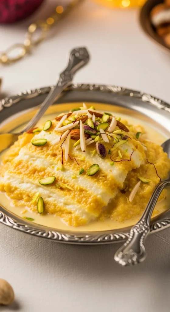 Serve warm in small portions because it is rich. Press lightly into small bowls and flip onto plates if you want a neat shape. Add extra pistachios or edible silver leaf for that proper dawat look people notice immediately.