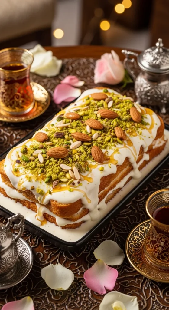Serve warm so the cheese stays soft and slightly stretchy. Sprinkle crushed pistachios generously and cut into squares for easy sharing during Eid gatherings.