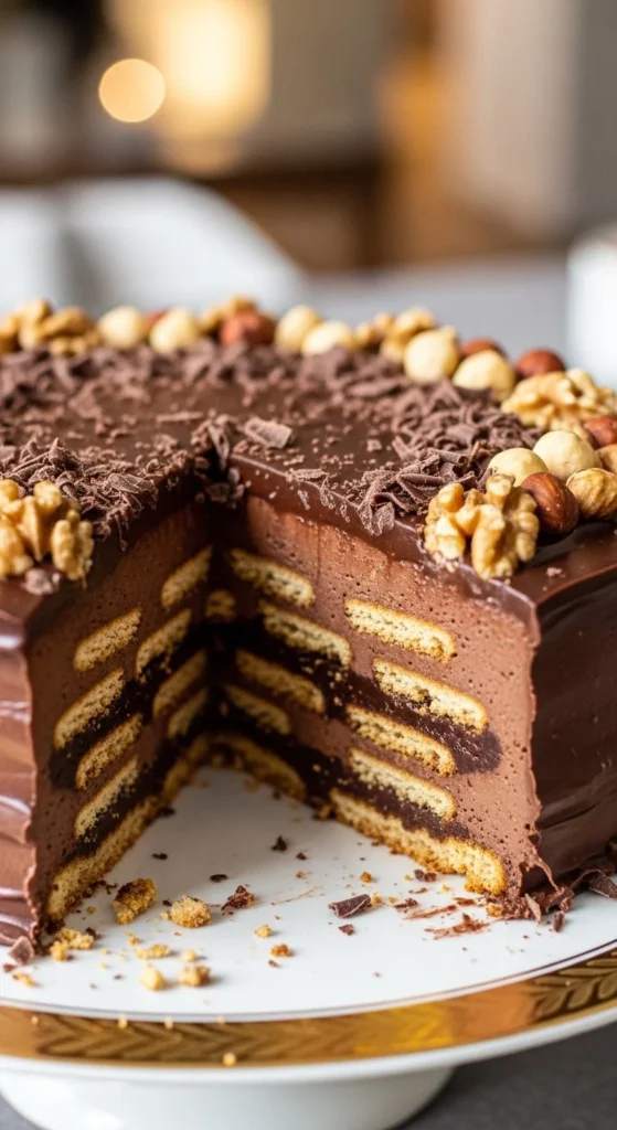 This is the dessert that secretly saves tired hosts. No baking, no complicated timing, just layers of biscuits wrapped in rich chocolate. Kids love it immediately, and adults somehow finish it faster than expected. It also travels well if you are taking dessert to someone else house.