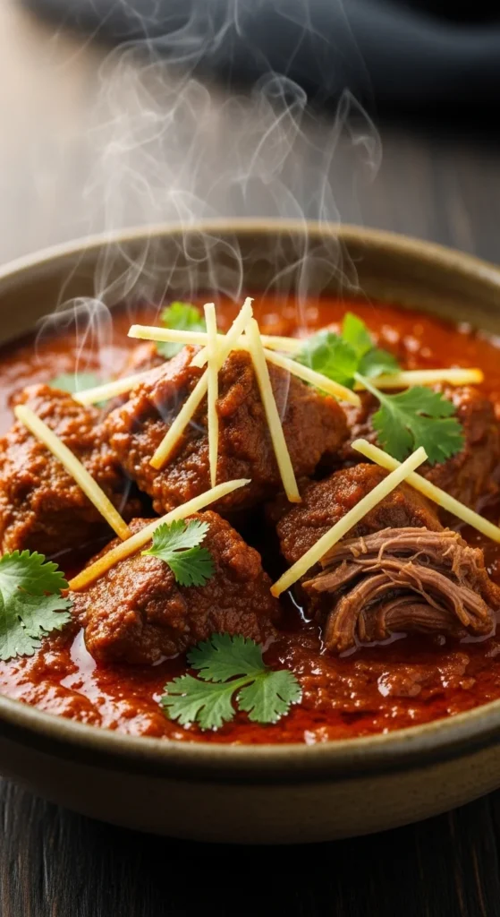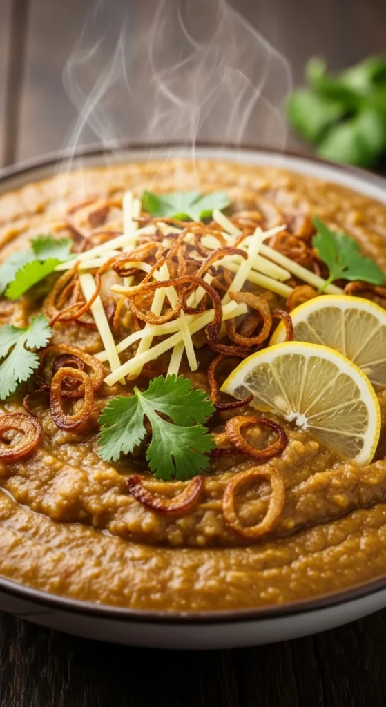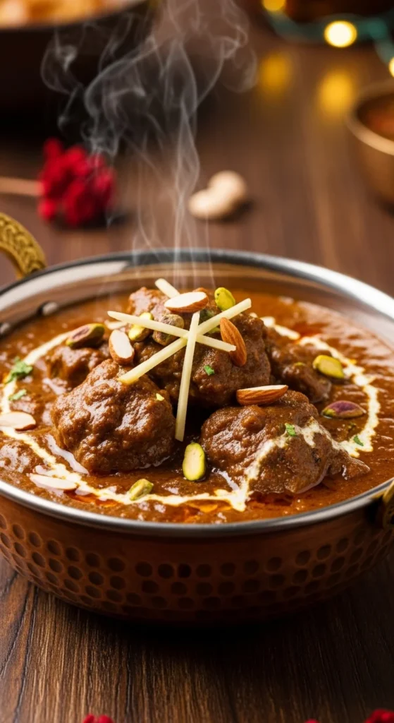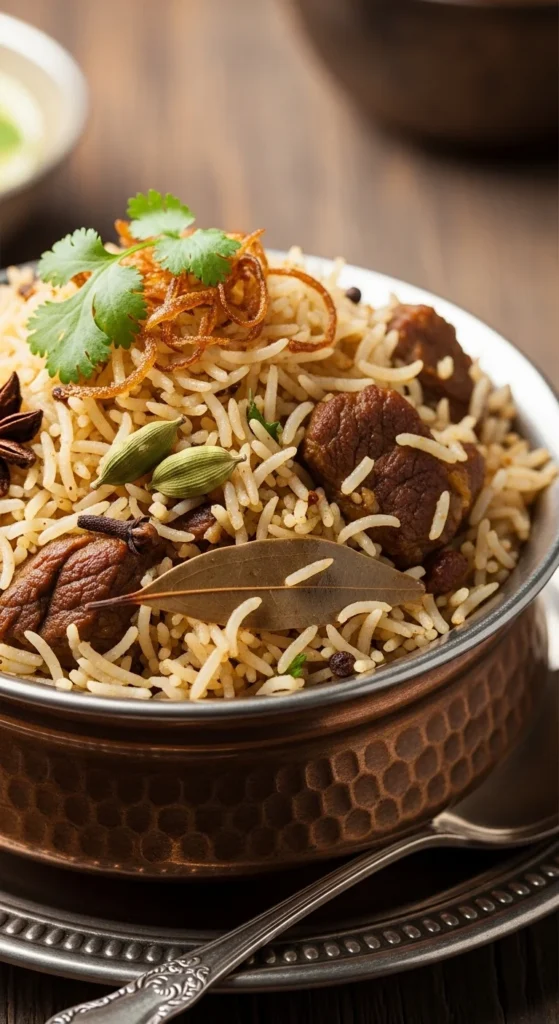 Zarda is known for its bright color and festive look. It is sweet rice flavored with cardamom and sugar, often decorated with nuts and candied fruit. Many families prepare it for large Eid gatherings. Its appearance alone makes the table feel celebratory.