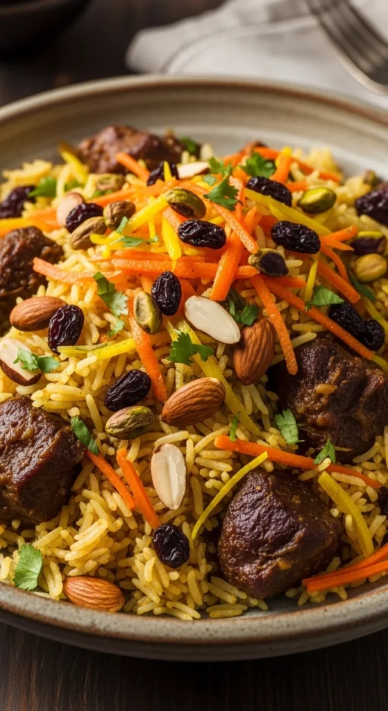 Kabuli pilaf brings a slightly sweet and aromatic touch to the table. The carrot and raisin topping makes it unique. It is popular in many regions for celebrations. The mix of sweet and savory feels festive.