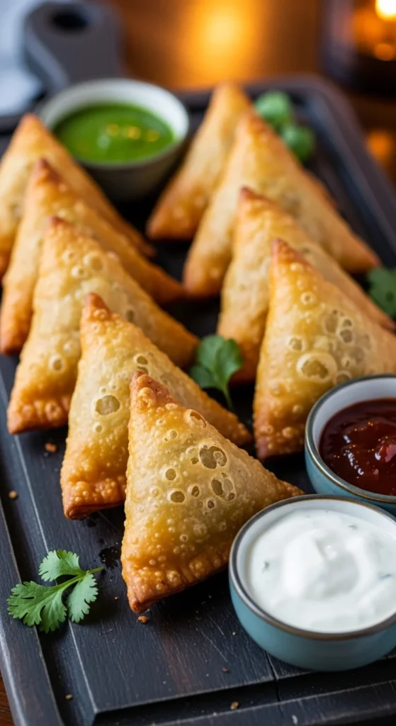 Samosas are almost always present at festive tables. Their crisp shell and savory filling make them a favorite for all ages. They can be prepared earlier and fried when needed. They disappear quickly at gatherings.