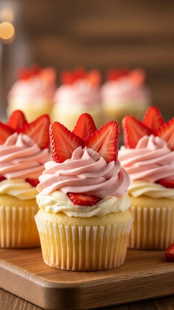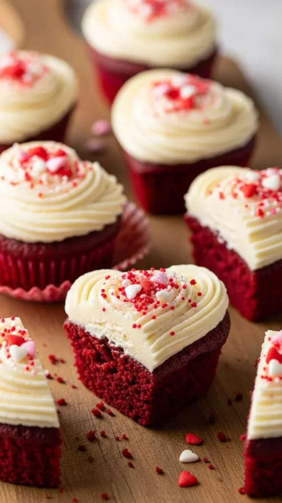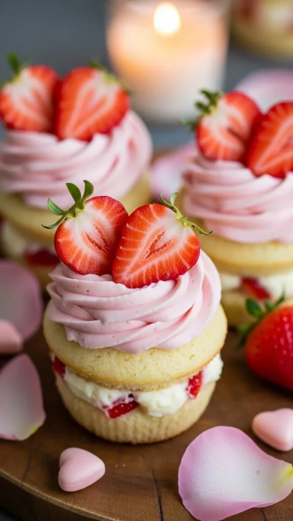 Surprise-center desserts appear often in Valentine baking because they feel thoughtful and playful. These cupcakes look classic on the outside but reveal a creamy strawberry filling inside, adding a sweet handmade touch.