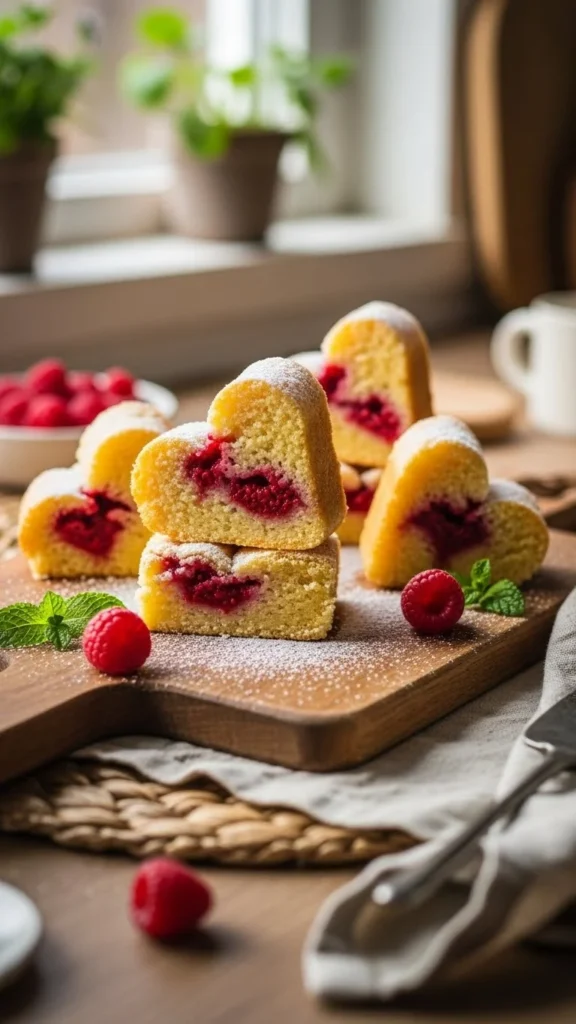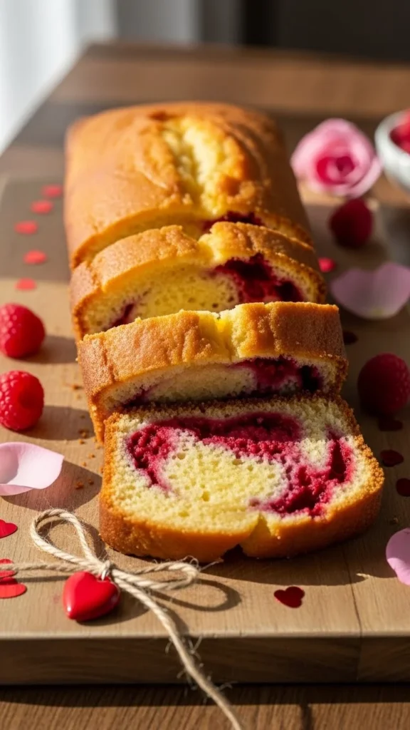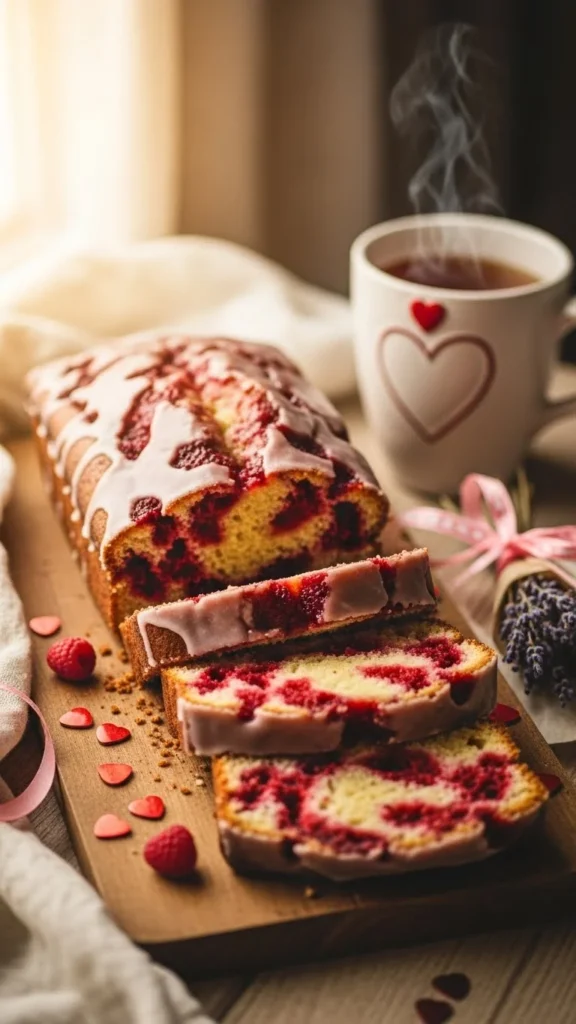 Valentines cake loaf looks artistic without requiring decorating skills. The raspberry swirl adds flavor and a natural pink tone that fits the romantic theme.