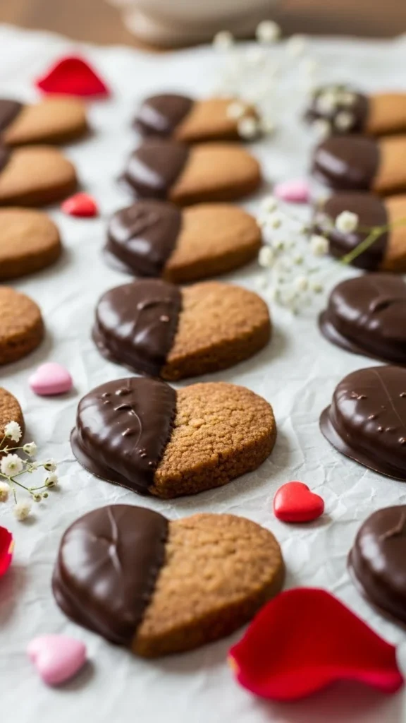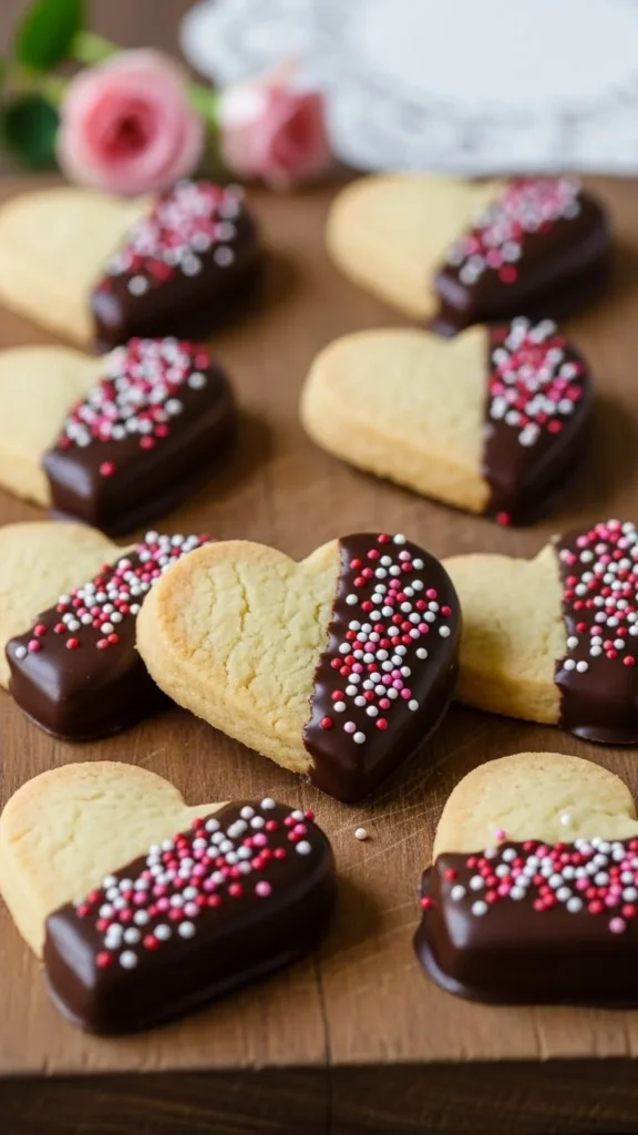 Shortbread hearts dipped in chocolate create an elegant handmade effect. The contrast between pale biscuit and dark chocolate looks refined while still being simple enough for home bakers.