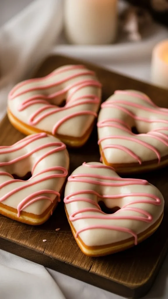 Heart shaped baked donuts feel playful, nostalgic, and handmade. The vanilla glaze keeps the look soft and simple instead of overly decorated.