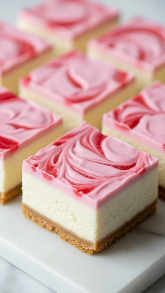 Strawberry swirl cheesecake bars have natural pink swirl that creates a romantic finish without artificial color. The smooth texture and handcrafted look make them feel thoughtful and special.