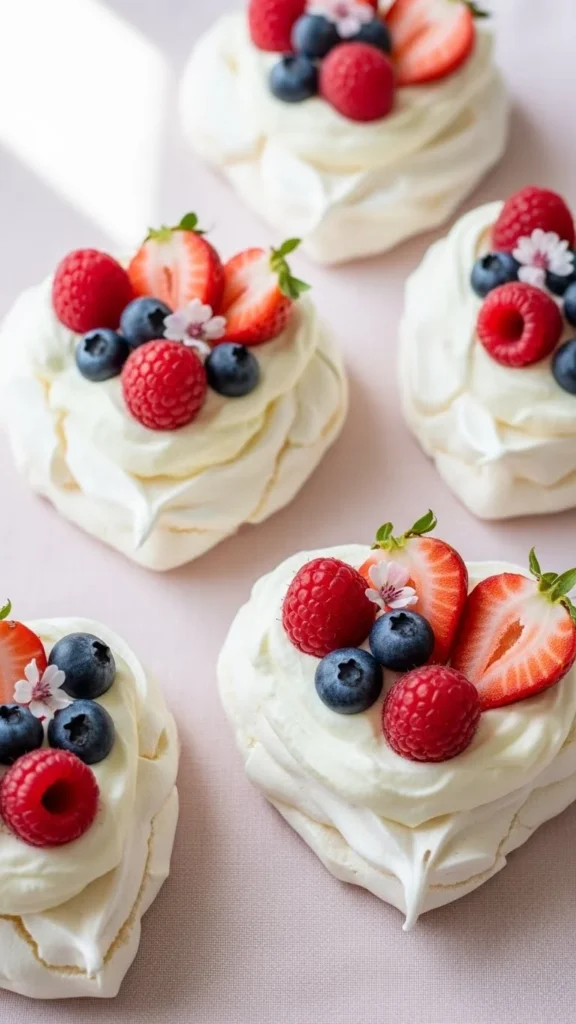 Mini pavlovas feel handmade because the meringue shapes stay slightly uneven and natural. The crisp shell and soft center create a light and elegant Valentine dessert.