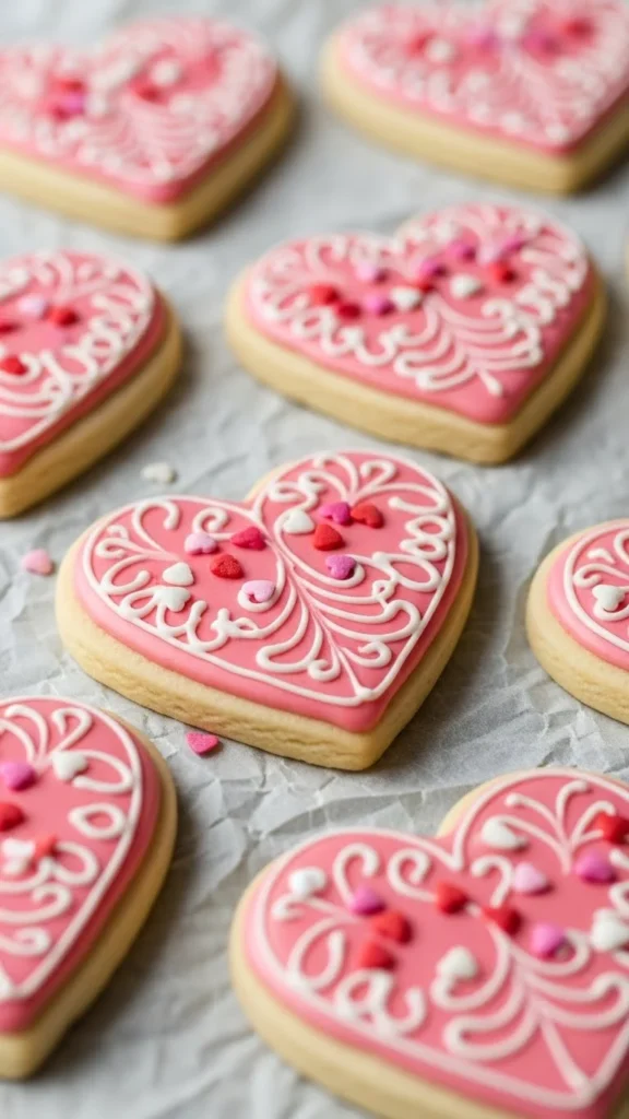 Heart shaped sugar cookies are one of the most common Valentine bakes because they feel personal and handmade. Each cookie can be decorated differently using pastel icing, light piping, and sprinkles, which makes them perfect for gifting or decorating at home together.