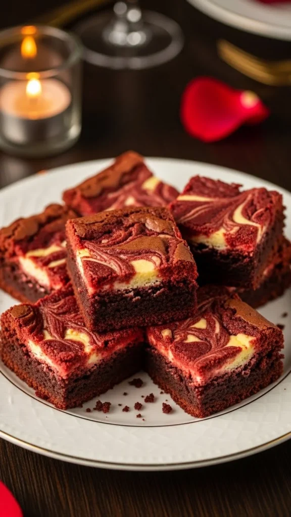 Red velvet brownies feel romantic because of their bold red crumb and soft texture. Many recipes include a cream cheese swirl, which adds a bakery style look without making the recipe complicated.