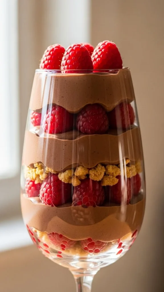 This parfait layers smooth chocolate cream with bright raspberries and crunchy crumbs. The contrast in textures makes each spoonful interesting. It also looks elegant in clear glasses.