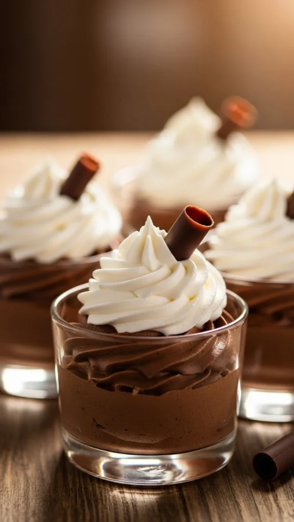 Chocolate mousse is light, silky, and airy, making it a luxurious yet gentle dessert. The texture feels smooth and creamy without heaviness. Individual cups make serving effortless.