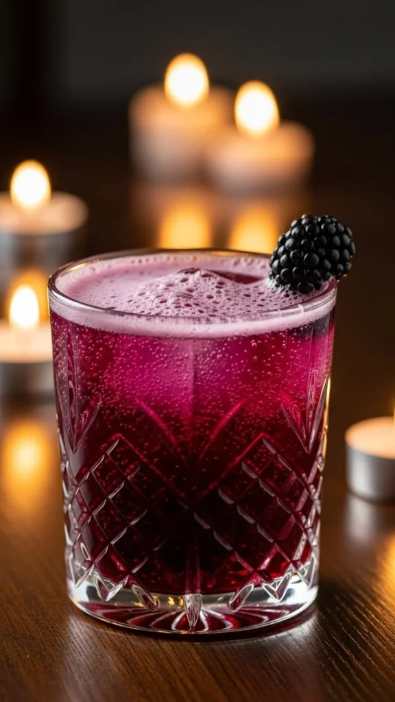 This mocktail uses dark berry juice to create a rich, deep color that feels dramatic and romantic. The sparkling finish keeps the drink lively and refreshing.