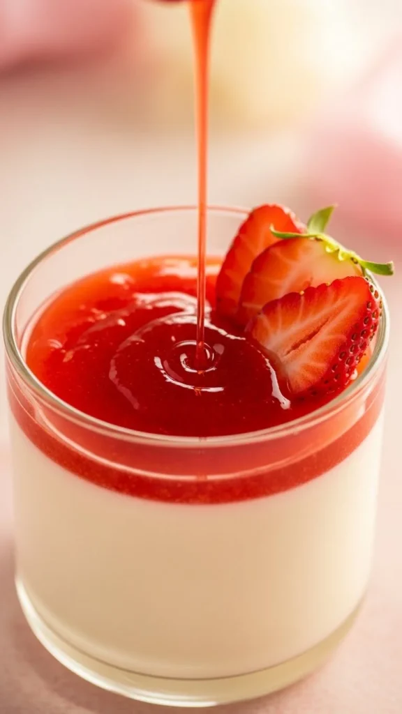 This panna cotta is smooth and gently sweet with a silky texture. The strawberry topping adds balance and color. Elegant and calm.