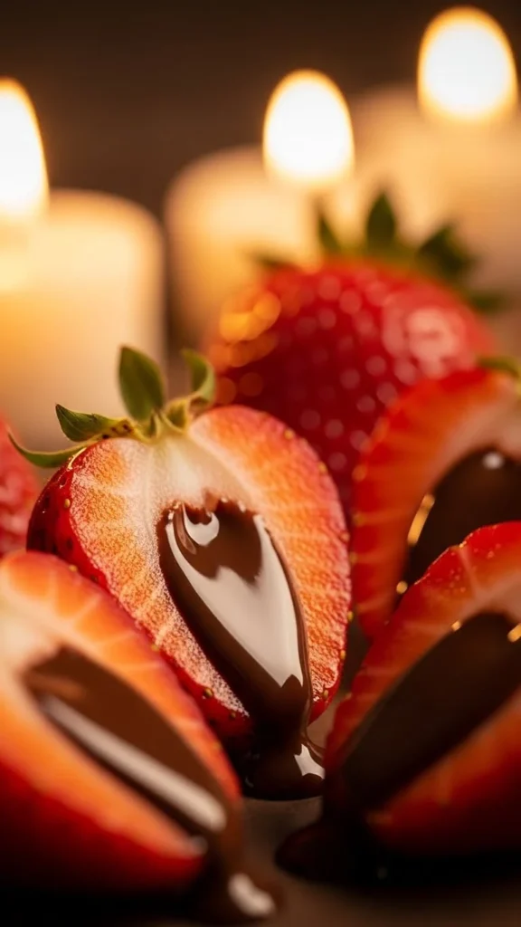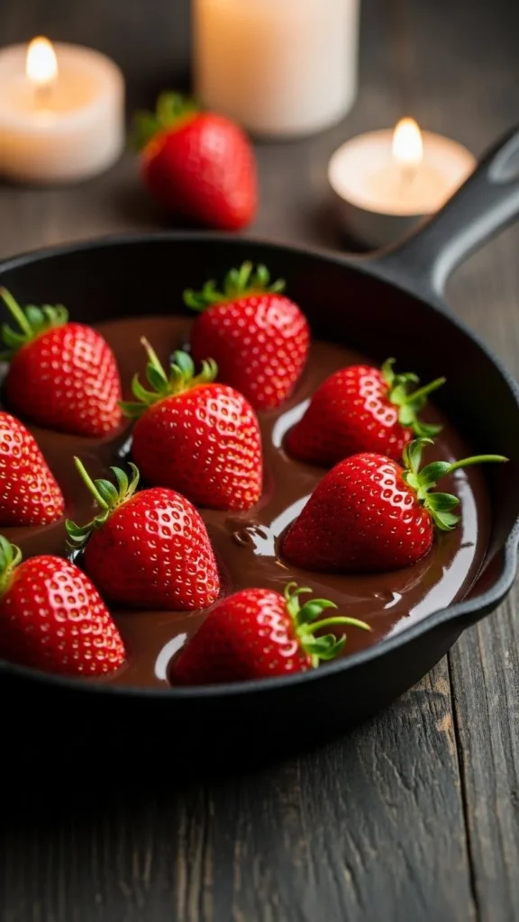 This dip is warm, gooey, and perfect for sharing. The strawberries soften in the chocolate, creating a rich bite. Very romantic and interactive.