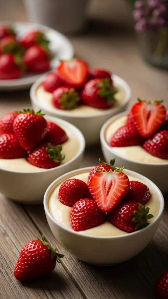 This custard is smooth, creamy, and gently sweet. The strawberries add freshness and color. Simple yet elegant.