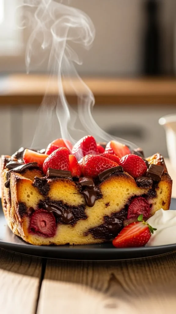 This pudding is soft, warm, and deeply comforting. The chocolate melts into the custard, creating richness. Perfect for cold Valentine’s nights.