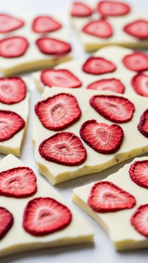 This bark is sweet, crisp, and easy to make ahead. The strawberries add color and balance. Great for gifting.