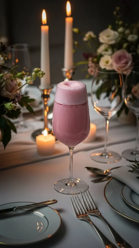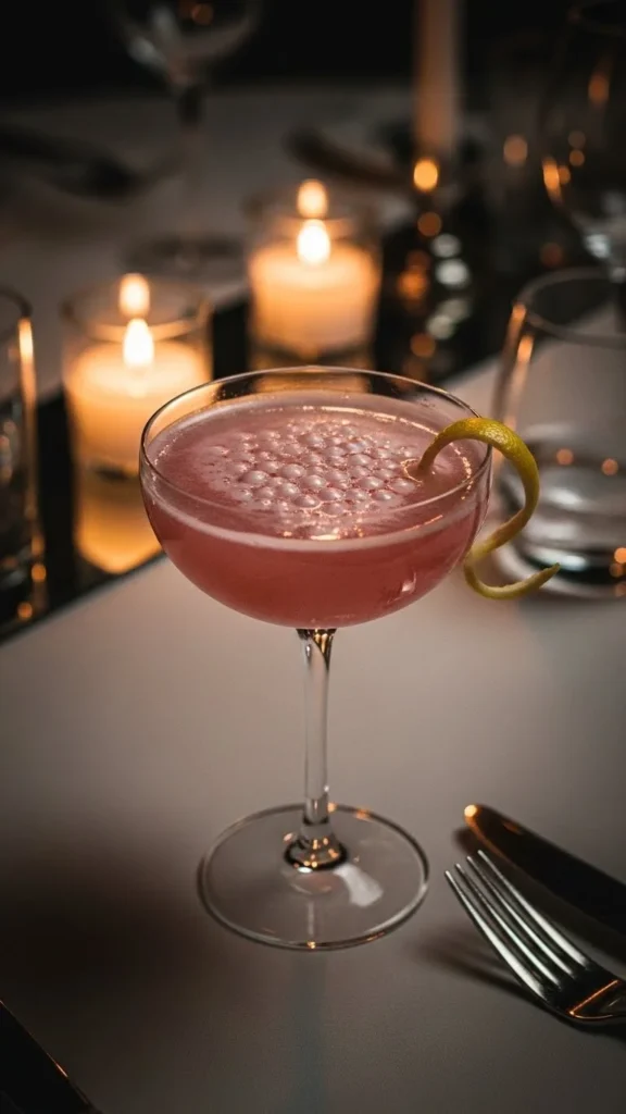 Serve chilled with a delicate lemon twist. The color and fizz give it a polished, romantic feel.