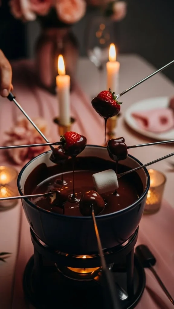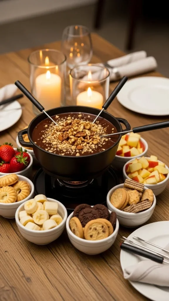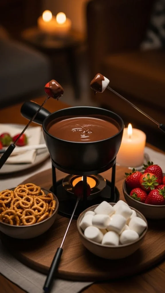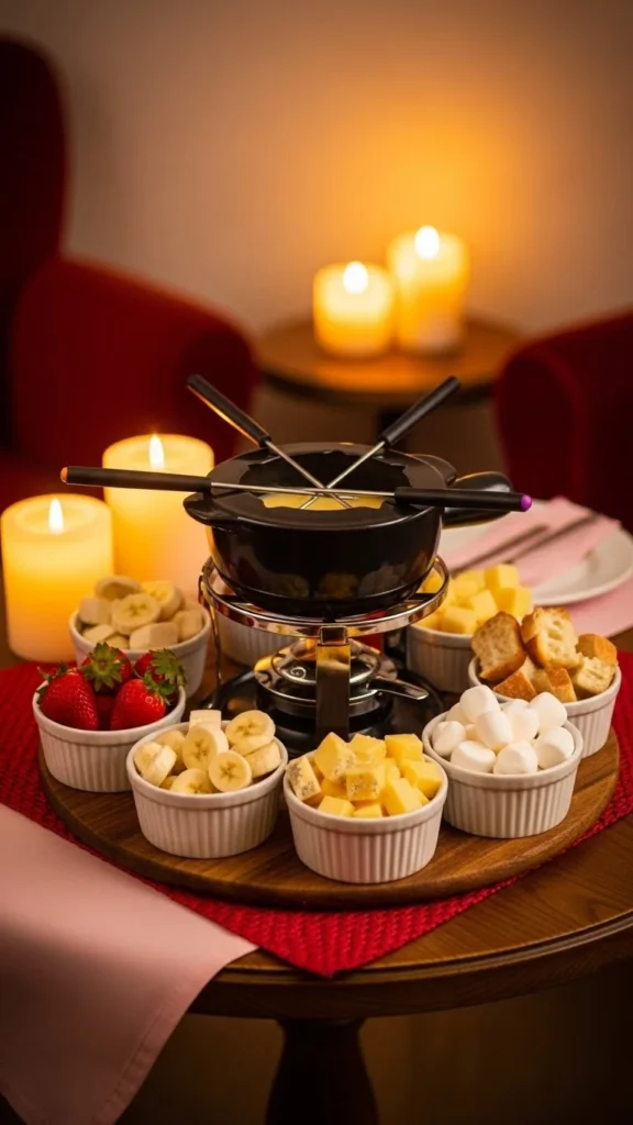 Let each person choose their favorite flavors to personalize the experience. Keep the environment cozy and unhurried. This style of fondue night feels playful, relaxed, and romantic.