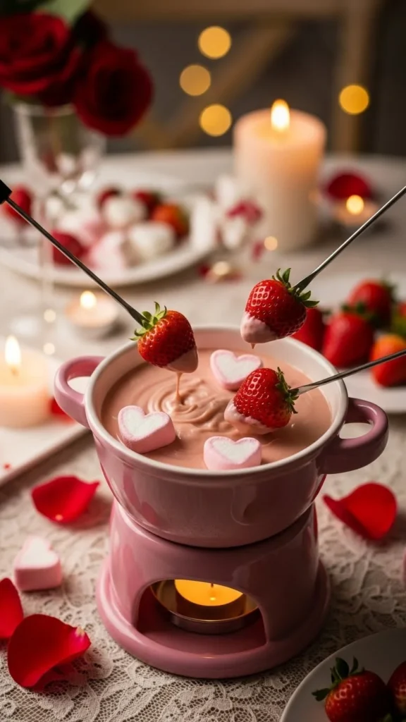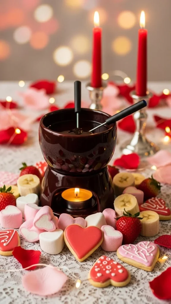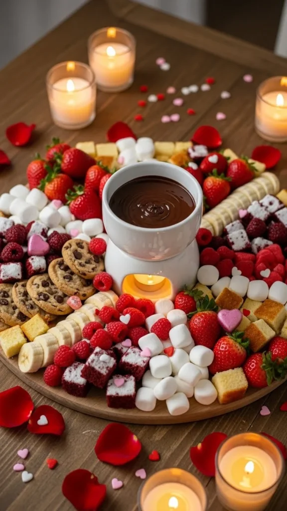 This fondue idea focuses on presentation to create a clear Valentine theme. Heart-shaped dippers make the experience feel sweet, romantic, and visually fun. It is simple to create but feels thoughtful.