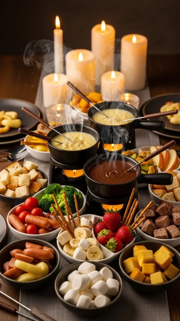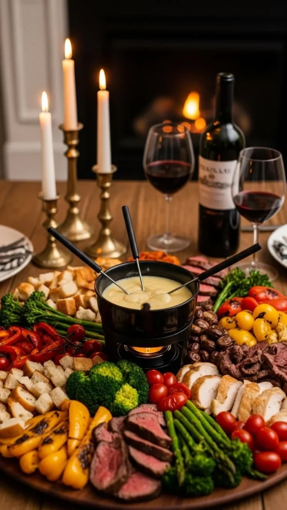 This idea focuses as much on the dipping board as the fondue itself. Roasted potatoes, vegetables, bread, and meats make the experience playful and varied. It turns the meal into a mix-and-match tasting experience.