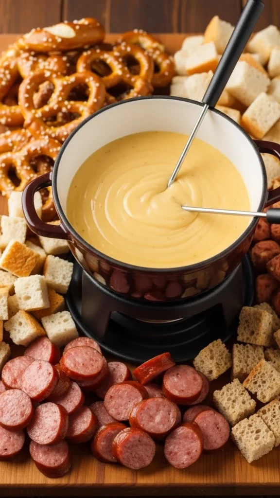 Serve with warm pretzels and sliced sausage for a fun pub-style twist. This version works especially well for couples who prefer savory foods over sweets. Keep drinks simple so the fondue flavor stands out.