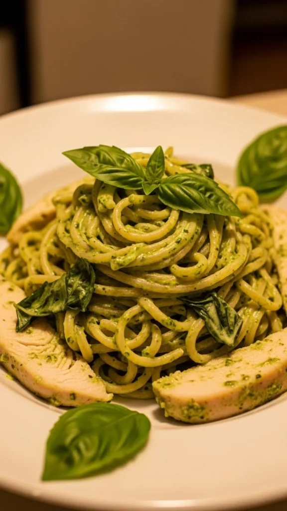 Pesto pasta remains a favorite for those who want something less heavy than pure cream sauces. Blending pesto with cream softens the herb flavor and creates a smooth texture. Chicken makes it more filling without making it dense.