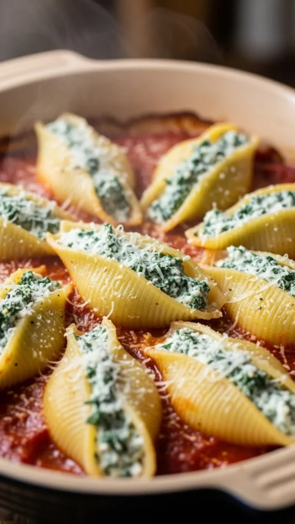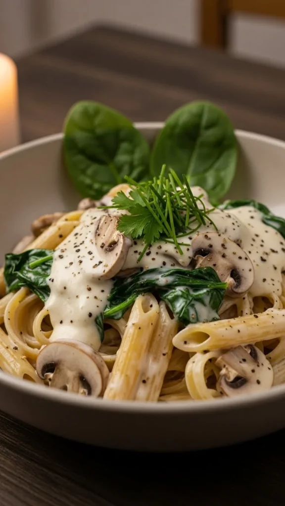 This vegetarian pasta delivers warmth and depth from mushrooms while spinach adds freshness. It suits couples who prefer plant-based meals or lighter flavors.