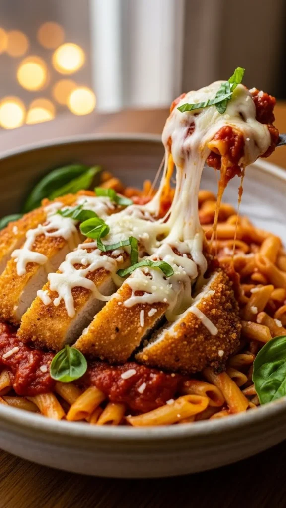 This pasta turns the classic chicken parmesan into a bowl format. It combines tomato sauce, cheese, and tender chicken, creating a filling and familiar dish.